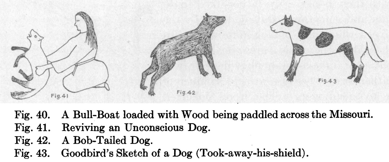 Wilson recorded that for the Hidatsa the dog was still an important beast of burden, whose care and management was left to women. One woman in particular, Maxidiwiac or Buffalo Bird Woman, who spoke no English, was the source of most of Wilson�s information. She felt that �horses did not learn to know their names as did dogs, nor do I think they are as intelligent as dogs.� The first drawing from Wilson�s book shows an unconscious dog being revived by a woman, probably after the dog choked when eating too fast, as well as two dogs of her tribe. Buffalo Bird Woman described her tribe�s dogs: